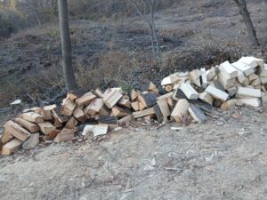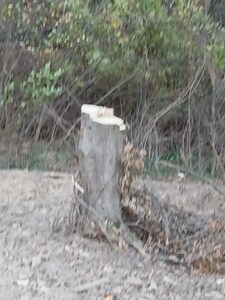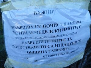 Първото, което трябваше да проверим, е законна ли е тази сеч. На табелка , закачена на едно от оцелелите дървета ниско до пътя, пишеше: „Извършва се почистване на частни земеделски имоти с номера… Разрешителните за почистването са издадени от Община Габрово. От собствека на имотите”. Явно е искал да напише „от собственика на имотите” , но не се е получило.